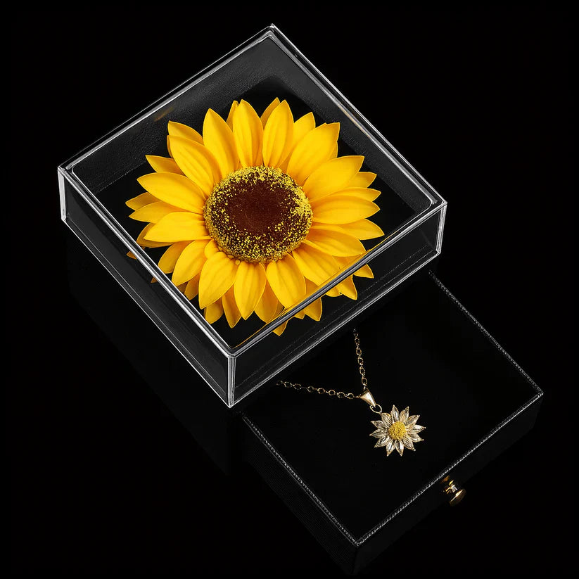 Brighten someone's day with this stunning sunflower necklace gift box. Featuring a sparkling sunflower pendant in a luxurious gift box with a lifelike sunflower, this necklace symbolizes happiness, warmth, and love. A perfect gift for birthdays, anniversaries, or simply to show someone you care.