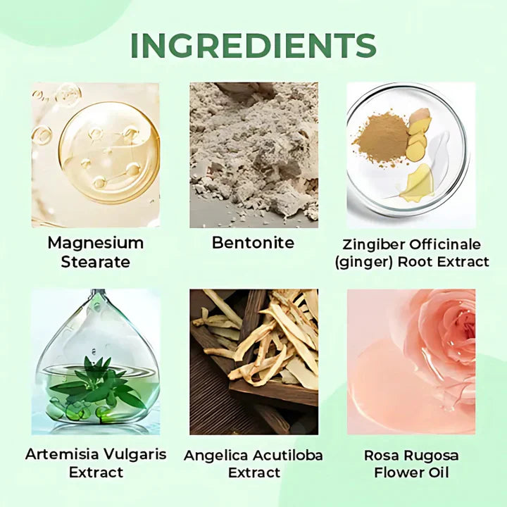 | Ingredients | Magnesium Stearate, Bentonite, Zingiber Officinale (Ginger) Root Extract, Artemisia Vulgaris Extract, Angelica Acutiloba Extract, Rosa Rugosa Flower Oil |